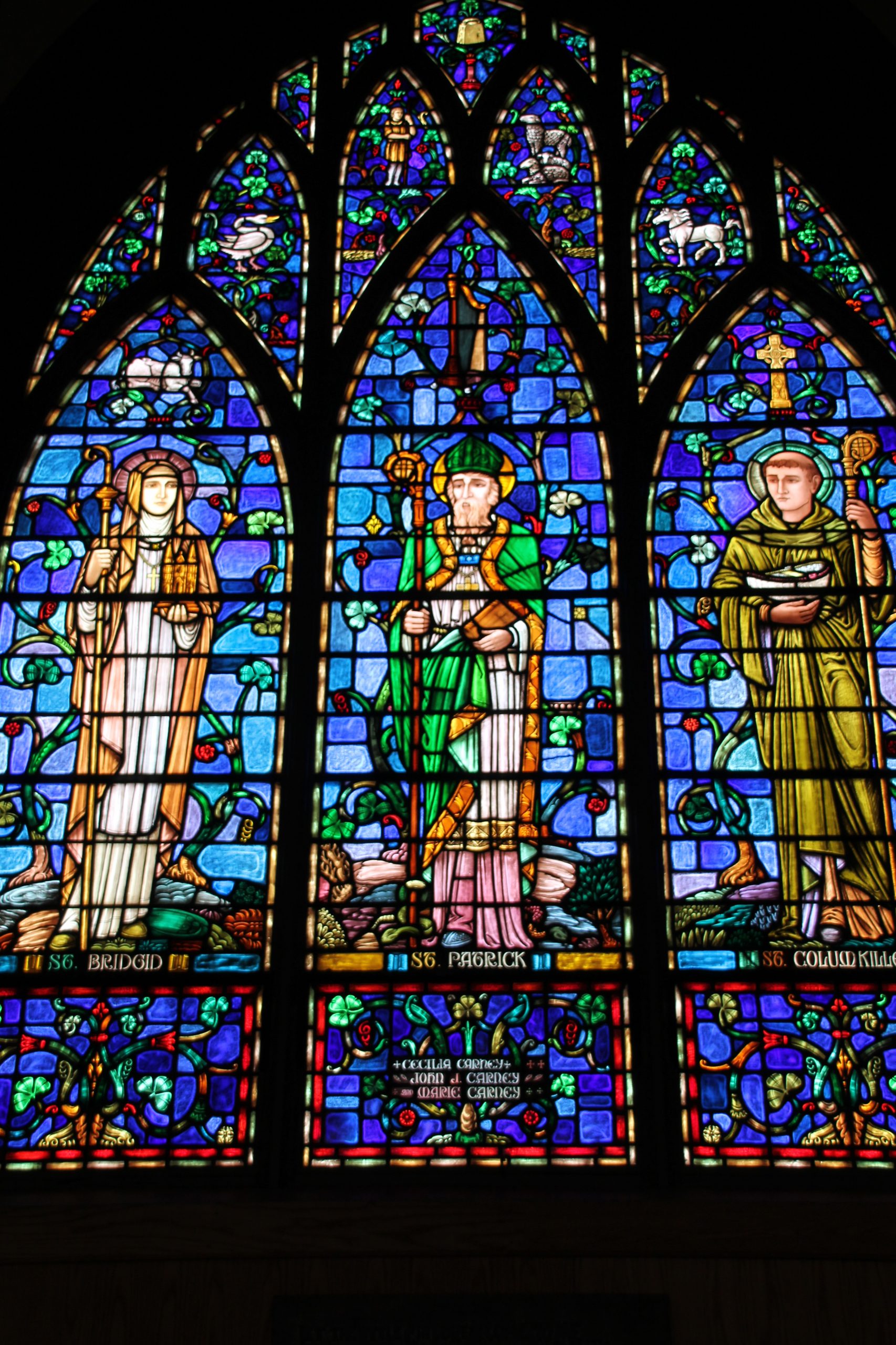 I was impressed by the strikingly gorgeous stained glass window featuring St. Patrick, St. Brigid, and St. Columbkille. The window is adorned with a variety of shamrocks in vast hues of green and symbols of each saint. While editing the photos days later, I was intrigued by the bottom panel of the window which disclosed that the window was dedicated to Cecilia Carney, John J. Carney, and Marie Carney. My curiosity piqued; is this the same family as the owners of Kamms Plaza.