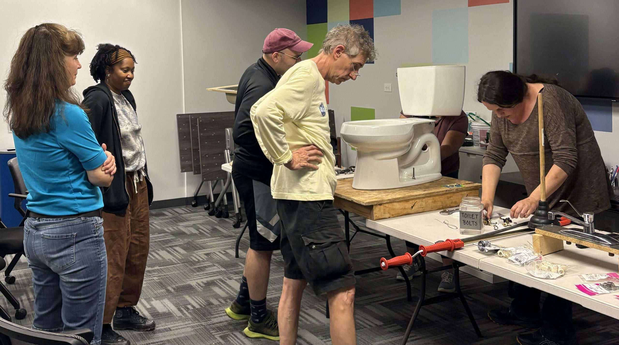 The class learned how to handle common plumbing problems like a leaky faucet, running toilet, and even how to replace the wax ring and properly install a new toilet.