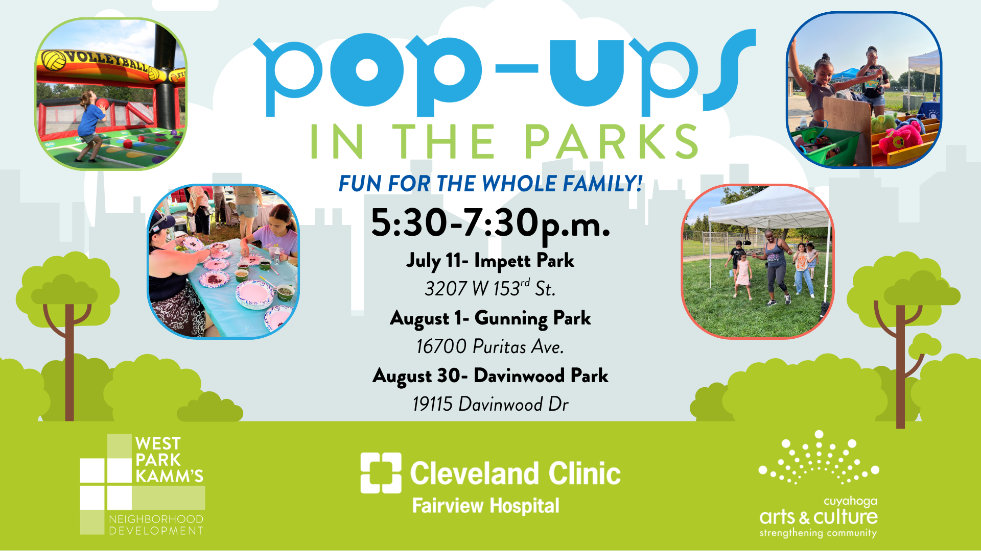 Davinwood Park 19115 Davinwood Dr, Cleveland, United StatesJoin us for arts activities, games, fun, and FREE ICE CREAM in your local park! Bounce houses, crafts, education stations, and interactive arts programming are all waiting for you at our Pop Ups in the Parks. Partners include: Recess Cleveland, Talespinner Children's Theatre, Cleveland Museum of Art, YMCA, Upcycyle Parts Shop, Cleveland Public Library, and…